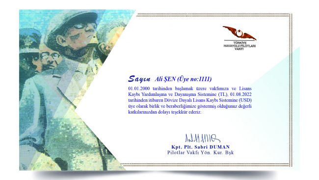 Değerli üyemiz, Vakıf, Lisans Kaybı Yardımlaşma ve Dayanışma Sistemi (TL) ve Dövize Dayalı Lisans Kaybı Sistemi (USD) katılımcısı olan tüm üyelerimiz adına örnekte görüleceği üzere e-üyelik sertifikaları hazırlanacaktır. Hazırlanan e-sertifikaların zaman içerisinde tüm üyelerimize gönderimi sağlanacaktır. Bilginize saygılarımızla iletir sağlıklı günler ve emniyetli uçuşlar dileriz.
