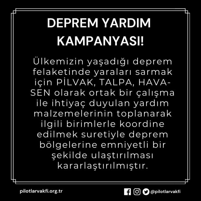 Değerli üyelerimiz, Ülkemizin yaşadığı deprem felaketinde yaraları sarmak için PİLVAK, TALPA, HAVA-SEN olarak ortak bir çalışma ile ihtiyaç duyulan yardım malzemelerinin toplanarak ilgili birimlerle koordine edilmek suretiyle deprem bölgelerine emniyetli bir şekilde ulaştırılması kararlaştırılmıştır. Öncelikli yardım malzemelerini aşağıdaki birimlere teslim edebilirsiniz. • Türkiye Havayolu Pilotları Vakfı İstanbul Merkezi – Yeşilköy Serbesti Caddesi, No:6, Bakırköy/İstanbul, Çalışma…