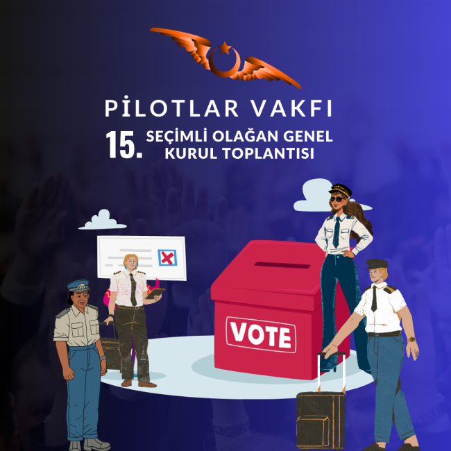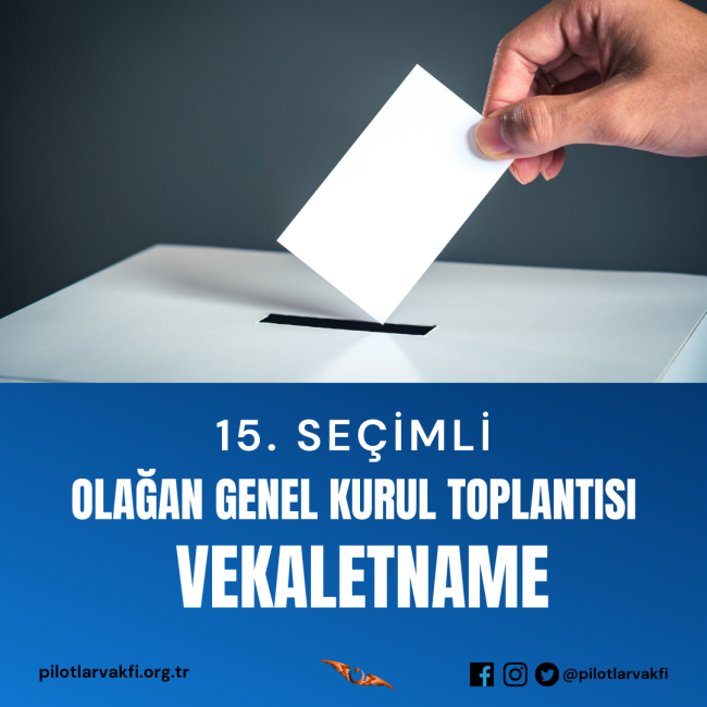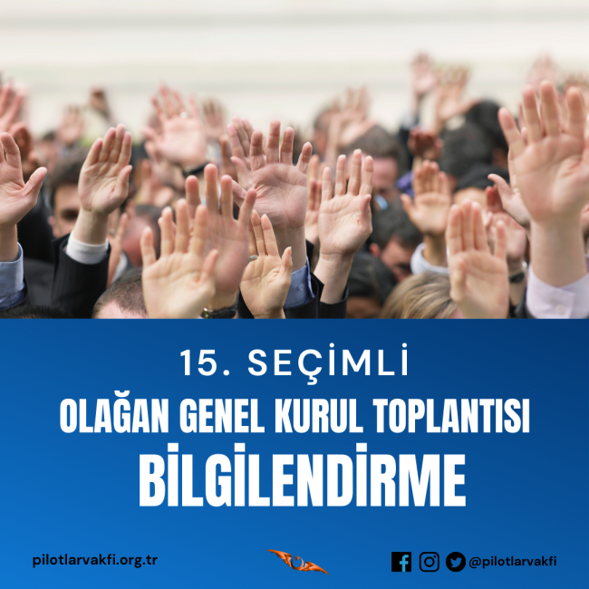 Değerli üyemiz; Vakfımızın 15. Seçimli Olağan Genel Kurul 1. Toplantısı 21.04.2024 Pazar günü saat 09:00’da Serbesti Caddesi No.6 Yeşilköy/Bakırköy/İstanbul adresinde bulunan Vakıf merkezimizde, salt çoğunluk sağlanamadığı takdirde; 2. toplantı 28.04.2024 Pazar günü 09:00 – 17:00 saatleri arasında Yeşilköy, DHM A kapısı yanı, Yeni Havaalanı Cd, Bakırköy/İstanbul adresinde bulunan SHGM Türk Sivil Havacılık Akademisi’nde icra edilecektir.…